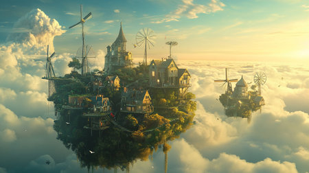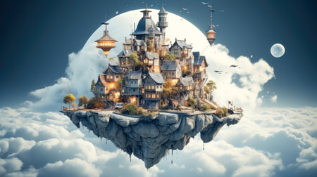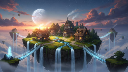 An illustration depicts a whimsical floating village set among the clouds. Featuring lush green islands connected by waterfall bridges, the scene showcases rustic buildings and a large moon. The composition uses soft colors, creating a serene ambiance suitable for various fantasy-themed designs and editorial applications.