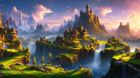 Surreal dreamscape of floating islands with lush forests and waterfalls backdrop