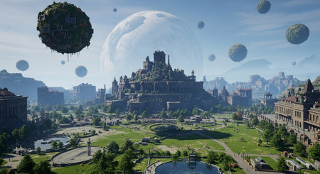 a sprawling cityscape features a grand castle, floating spheres, and a bright sky with a large moon above.