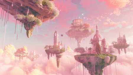 Floating islands in pastel sky surreal architecture and flora summer wonder background