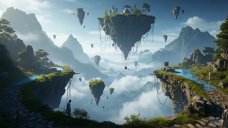 A surreal fantasy landscape featuring floating islands adorned with greenery and ancient structures, amidst misty mountains.
