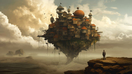 the island floats serenely on the vast ocean, with a man and child standing on its edge. the steampunk-inspired design adds a contemporary twist to the medieval art style, while the intricate cityscape and vernacular architecture create a stunning visual. the low depth of field adds a dreamy quality to the uhd image, making it a perfect addition to any collection. the barroco influence is