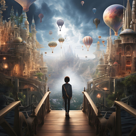 Man standing on wooden bridge with fantasy cityscape and hot air balloons