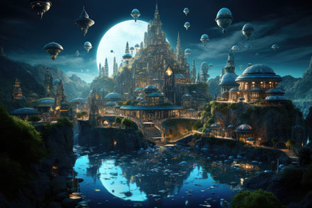 Fantasy landscape with fantasy buildings and river at night. Digital painting.