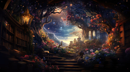 Mystical landscape with glowing trees, moonlit sky, and serene waters in a fantasy world setting. Perfect for dreamy designs