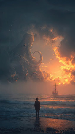 Surreal landscape with octopus and a man looking at the sea