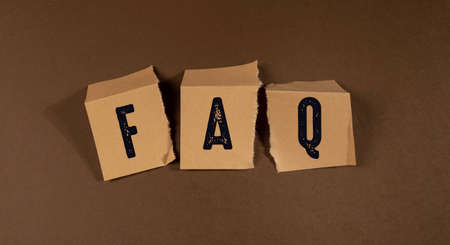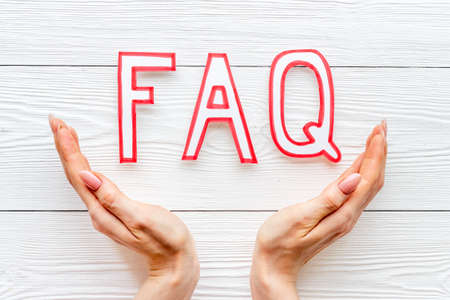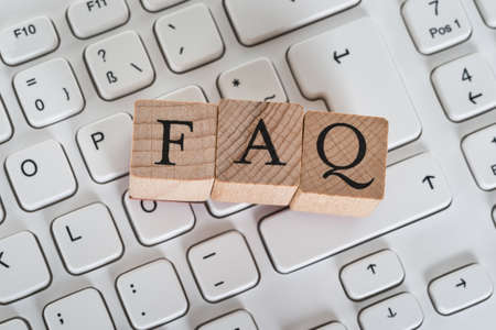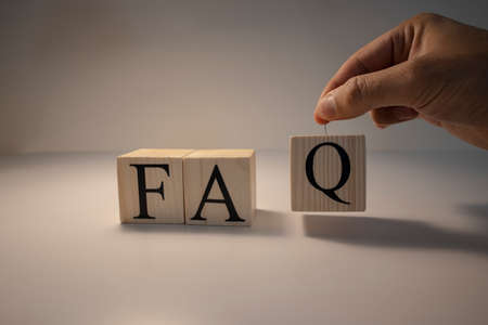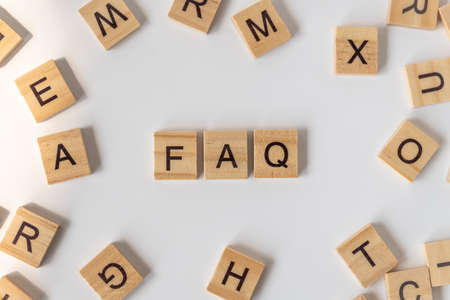 Frequently asked questions Concept. Wooden letter block wording FAQ with other letters on white background.