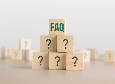 Colorful wooden cube blocks with text FAQ and question marks