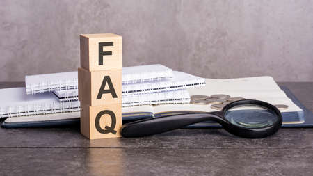 the word FAQ is written on wooden cubes on a gray background. close-up of wooden elements, magnifying glass, paper documents and coins on a notebook. FAQ - short for Frequently Asked Questions