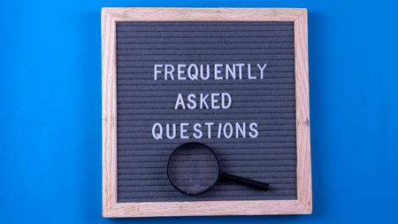 Brown card and glasses written with text Frequently Asked Questions on blue background.