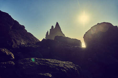 Dramatic Seascape over the beach during sunset, with rocky volcanic cliff is lit by the warm sunset. Clear sky, no clouds. Nobody. The concept of calmness silence and unity with nature. Slow motion.