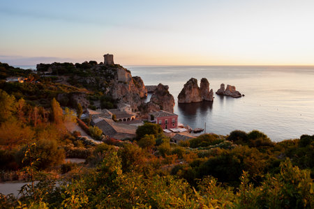 Evening twilight view of beautiful Tyrrhenian sea bay and the Faraglioni di Scopello from above, Province of Trapani, Sicily, Italy.
