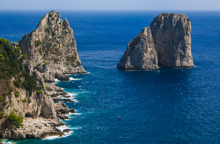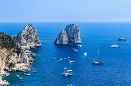 Faraglioni, attractive coastal rock formation eroded by waves, located off the coast of the island of Capri in the Gulf of Naples, Capri, Italy