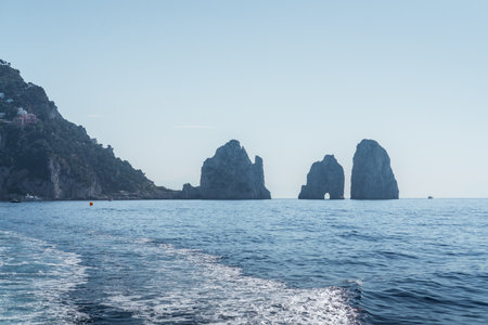 Capri, Italy - 04.29.2025: The famous Faraglioni rocks on the island of Capri, Italy. View from a boat floating away against a sky background.