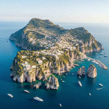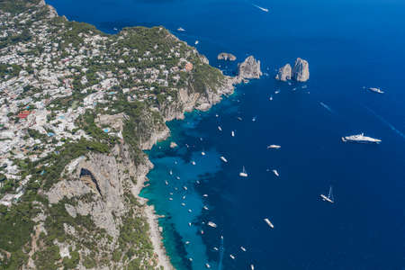 Aerial drone shot of south Capri coastline with faraglioni crag with luxury yachts in Tyrrhenian sea