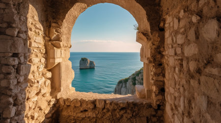 Generative AI, historic medieval stone arch windows with romantic view of sea or ocean, summer landscape background.