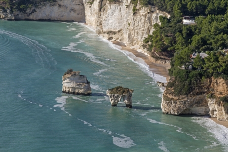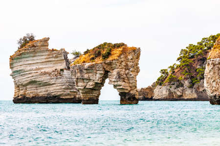Famous sea stacks of Baia delle Zagare bay in Gargano National park. Natural rock sculptures made by Adriatic sea waves, wind and erosion stacked in the sea near the rocky beach of Baia delle Zagare