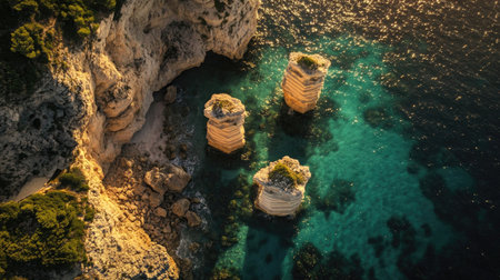 High angle view of dramatic rock formations rising from a turquoise sea. The formations are layered and textured, with varying shades of beige and light brown. The water surrounding the formations is a vibrant shade of turquoise, and the shoreline is visible with a mix of cliffs and greenery.