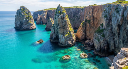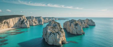 AI Generated. Aerial view of stunning coastal landscape with cliffs and blue ocean under serene sky