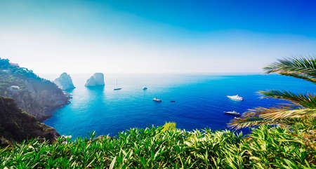 Panoramic view of famous Faraglioni Rocks, most visited travel attraction of Capri Island, Italy. Beautiful paradise landscape with azure sea in summer sunny day.