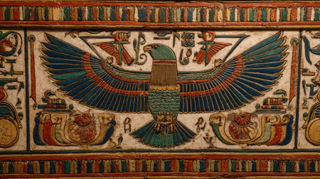 Detailed illustration of an Egyptian deity with outstretched wings, rendered in blue, gold, and red tones, surrounded by hieroglyphs on a textured papyrus background
