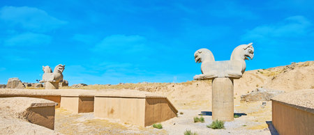 The column capitals with sculptures of griffons in Persepolis archaeological site, Iran.