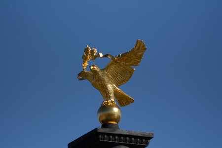 Golden eagle on a white column in sunlight