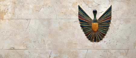 Ancient Egyptian Relief Winged Figures Flanking a Solar Disk, Symbol of Power and Protection.