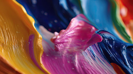 Bright and vivid paint colors blend together, showcasing swirls of pink, turquoise, yellow, and purple. The texture is smooth and glossy, highlighting the artistic expression.