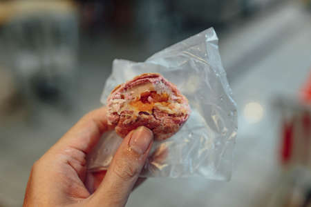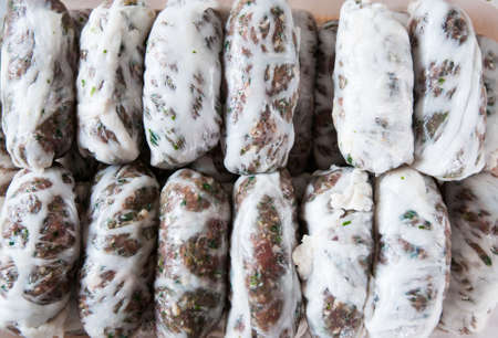 Spring Roll pastry with nuts, salted eggs for sell in the glass shelf in the market near China Town in Kuala Lumpur, Malaysia.