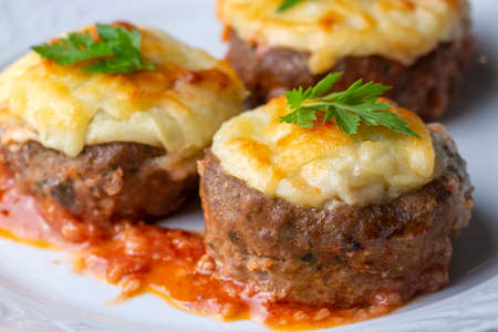 top view closeup tasty original of baked meatloaf served with mashed potato, cheese balls, and red sauce on white plate on wooden table