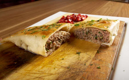 Meat roll with lentils and herbs. The food in the restaurant. Food styling and restaurant meal serving.