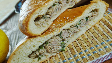 Delicious Lebanese (Arabic) food, genuine sfihas on a slate plate with tomatoes and lemons in the background with traditional Lebanese Keffiyeh (turban).