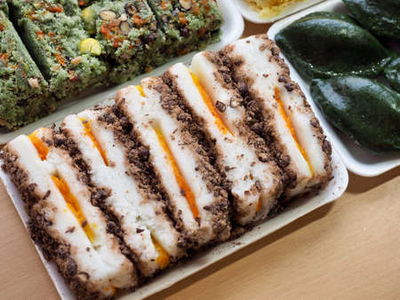 Vietnamese assorted conical sticky rice cakes stuffed banana and red bean on wooden background