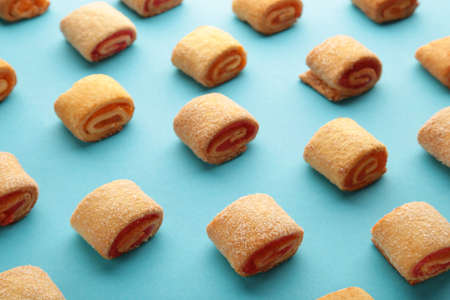 Homemade cookies, mini rolls with apricot jam on blue background.