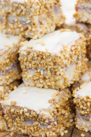 Traditional east German GDR shortcrust macaroon pastry tart Leiziper Lerchen variety in bakery showcase window