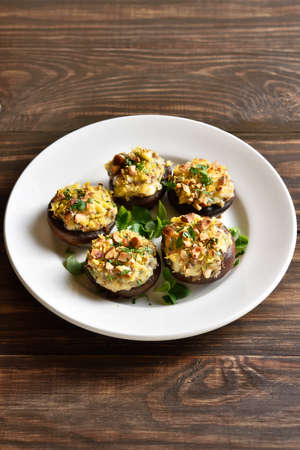 Stuffed mushrooms with cream cheese, bread crumbs and nuts on plate over wooden background.