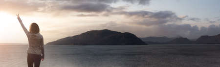 Woman standing with peace sign hand on the West Coast of Pacific Ocean. Sunrise or Sunset Sky Art Render. Panoramic Landscape from Alaska. Adventure, Love Concept Composite