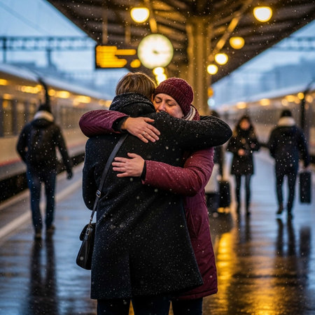 A couple shares an emotional hug on a snowy train station platform, surrounded by warm lights and blurred figures of people, capturing a poignant moment of love and farewell.