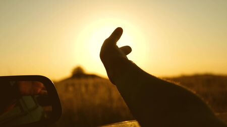 drivers hand is playing with sun from car window against beautiful sunset. Girls hand waves the sun. To travel by car