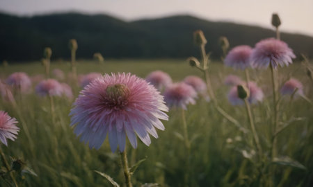 A captivating close-up of delicate pink wildflowers swaying gently against a serene blue and green background, evoking tranquility and beauty.