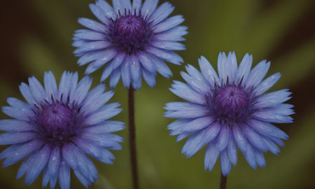 Blue wildflowers, cornflowers, on a green meadow in summer, in the sun. Selective focus. Bokeh. Copy space