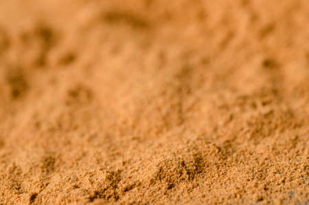 maca root powder on white ceramic plate against red textured paper, superfood concept