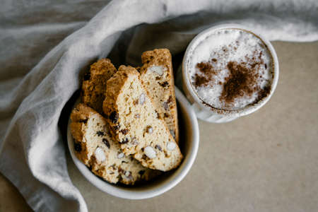 Freshly baked almond biscottis with cup of cappuccino on wooden background. Breakfast food concept.