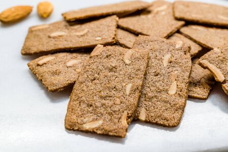Crispy Almond Thins Cookies / Wafer with Nuts on Marble Board. Organic Snacks.