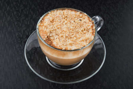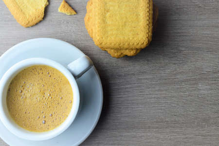 Close up. Cup with coffee with milk, accompanied by some baked cookies