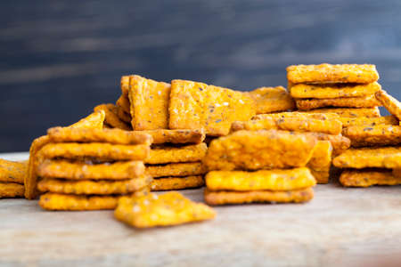 grain biscuits sprinkled with sesame seeds on a wooden background