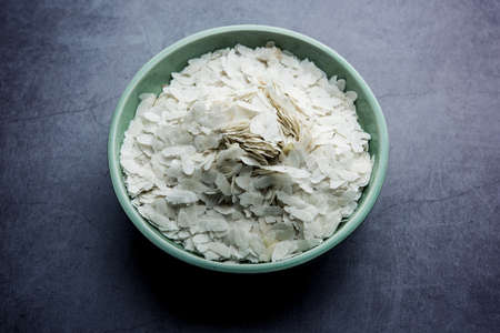 Raw Flattened Rice or Thick or thin Rice Flakes for Namkeen Chivda snacks or Aloo Poha for Indian Breakfast, served in a bowl