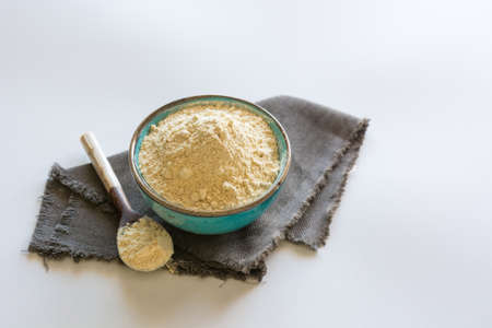 Whey protein powder sports bodybuilding supplement. White porcelain scoop with vanilla flavor powder. Brown background