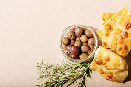 Baked focaccia bread served with olives. Traditional Italian Focaccia with rosemary over white texture background. Top view, flat lay. Copy space